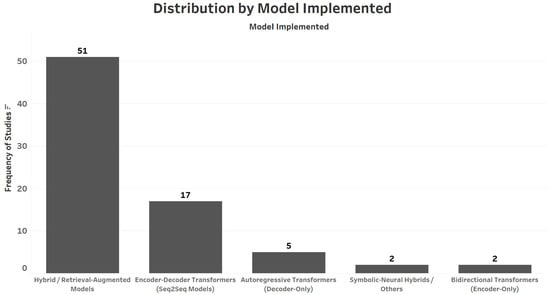We identified 77 studies focusing on our research area published between 2019 and 2024. During this timeframe, there has been a noticeable growth in interest in the topic, starting with the popularity of the launch of the generative AI application ChatGPT. Based on the studies, we could map the type of models implemented in each of the studies. The most frequently implemented models were Hybrid/Retrieval-Augmented Models, which combine LLMs with symbolic reasoning, external retrieval mechanisms, or structured knowledge sources to enhance factuality, transparency, and contextual grounding. These models were prevalent across diverse applications such as question answering, semantic search, and Knowledge Graph construction, followed by Seq2Seq Models, which are Encoder–Decoder Transformers like T5 and BART and were widely used for tasks such as summarization, translation, and KG-to-text generation. Autoregressive Transformers, particularly GPT-based models, appeared commonly in generative pipelines, especially for open-ended question answering. Bidirectional Transformers such as BERT were often applied in classification and entity extraction tasks. In contrast, fewer studies used Symbolic–Neural Hybrids/Others, including LSTMs and rule-based systems, primarily in specialized or low-resource scenarios. This distribution reflects a growing emphasis on hybrid and retrieval-augmented strategies for improving explainability and grounding in LLM–KG pipelines. Table 2 summarizes our mapping for model implementation. Our dataset is available at https://doi.org/10.6084/m9.figshare.28468637.v1 accessed on 1 March 2025 [17].