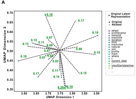 Contrastive learning has emerged as a powerful technique in unsupervised machine learning for learning representations by maximizing agreement between differently augmented views of the same data example via a Normalized Temperature-Scaled Cross-Entropy loss (NT-Xent Loss) in the latent space [34,36]. In the context of SQL analysis, SimCLR (a simple framework for contrastive learning of visual representations) can be adapted for an unsupervised setting where the primary task is to create a latent representation where similar code is grouped, and different code is far away. This adaptation involves creating augmented versions of SQL data by selectively introducing unknown tokens, effectively simulating variations in SQL queries that a model might encounter in practical scenarios (Figure 1C). This method is advantageous for enhancing the model’s robustness and ability to discern nuanced differences in SQL queries, such as syntax errors or logical discrepancies. In our study, augmentation was implemented by replacing certain percentages of tokens in SQL sequences with a <UNK> token. Each SQL sequence was augmented at least five times, creating the positive pairs for the contrastive learning process. The percentage of tokens replaced in each sequence was determined dynamically during hyperparameter optimization for the contrastive model using the Optuna library (version 4.0.0). Over the course of 100 trials, with each trial running for 100 epochs and a batch size of 1024, Optuna explored a range of values for several hyperparameters (Figure 2A):