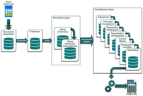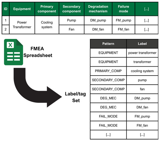 The FMEA for each asset is developed and periodically reviewed by expert committees in accordance with IEC standards, using technical specifications and equipment documentation. The structure of the FMEA aligns with the component hierarchies, degradation mechanisms, and failure modes defined within the proprietary catalogs of the organization’s maintenance ERP system. These catalogs also provide default classifications for failures of unknown origin or cases that cannot be precisely categorized. Maintenance technicians document work activities through structured forms that include both predefined fields (e.g., drop-down menus) and unstructured free text entries. Through straightforward operations, the information from the FMEA spreadsheets can be utilized to construct a table that links all maintenance-related terms with a list of entities. The maintenance work order texts can now be annotated with pattern-matching techniques using this table. In practice, this means finding an exact correspondance of the terms within the list, e.g., ‘transformer’, and assigning it a label, in this case ‘EQUIPMENT’. In this way, terms are identified and classified according to the same groupings as in the FMEA.