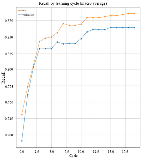Figure 6 shows the evolution of the macromean recall over training cycles, for the validation and test sample. The analysis of the curves shows that average recall increases rapidly over the first few training cycles and, after around five cycles, performance begins to stabilize. This indicates convergence of the model. The performance observed on the test sample indicates an excellent ability to generalize to new data. In the case of overlearning, a decrease in performance on the validation set would have been observed, which is not the case here. Furthermore, this chart demonstrates the model’s good performance, both in training and on new data.
