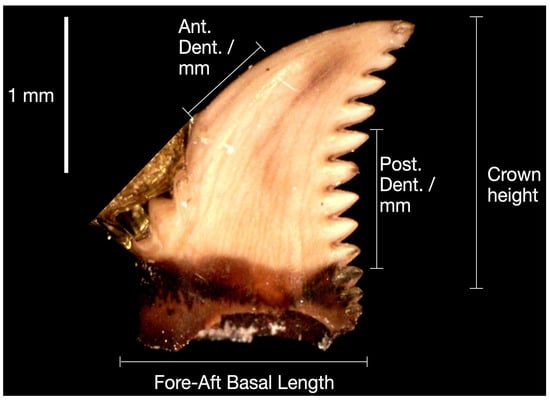 - Farlow, J.O.; Brinkman, D.L.; Abler, W.L.; Currie, P.J. Size, shape, and serration density of theropod dinosaur lateral teeth. Mod. Geol. 1991, 16, 161–198. [Google Scholar]
