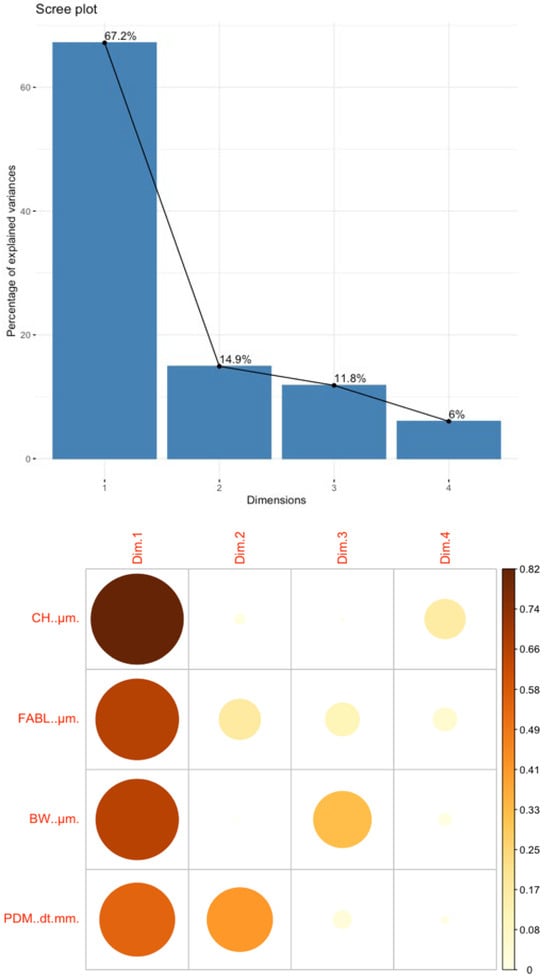 According to the PCA results, most of the data’s variance (82.1%) is found in dimensions 1 and 2 (top of Figure 5). Looking at the correlation plot (bottom of Figure 5), it is possible to see the presence of every feature per dimension. In Dimension 1, the most relevant feature is crown height (CH). In Dimension 2, the main features represented are primarily posterior denticles per millimeter (PDM), and much less importantly, fore-aft basal length (FABL). PCA was useful in analyzing the underlying variables of the microfossil dataset. The results highlighted the contributions of specific features to the overall variance, offering insights into patterns that are not readily apparent from the raw data.
