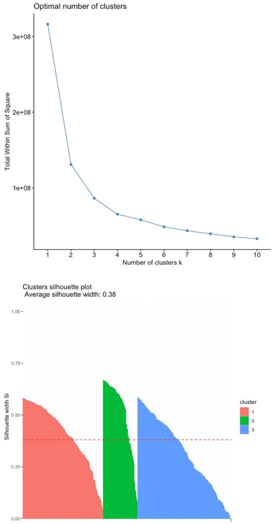 The Elbow and Silhouette Methods (Figure 6) were used to determine the proper number of clusters for splitting up the data in K-Means. The Elbow Method gives a quick visual representation to spot the optimal number of clusters. Still, it can sometimes be subjective as the curve does not always form a clear elbow, requiring judgment in ambiguous cases. The Silhouette Method provides a more quantitative measure of clustering quality. We used both methods to determine the number of clusters. As per the results from those algorithms in Figure 6, the K-Means algorithm was executed with three clusters.