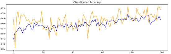 Eighty percent of the images were used for training and twenty percent for validation per cluster. The results for training the model through 100 epochs for each cluster are shown in Table 2. The number of epochs refers to the times the entire training dataset is passed through the model during the training process. Each epoch allows the model to learn from the data, adjusting its weights to minimize error. The classification accuracy and cross-entropy loss for each epoch are shown in Figure 8 and Figure 9, respectively. In both figures, the orange line represents the validation score, and the blue line the training score. The training score reflects the model’s performance on the data it was trained on, measuring how well the model has learned the patterns within this dataset. The validation score, on the other hand, evaluates the model’s performance on a separate dataset not used during training, serving as an indicator of how well the model generalizes to unseen data. These two lines are necessary to evaluate if the model is overfitted. A large gap between the two scores, with the training score being much higher, typically signals overfitting, where the model memorizes training data but fails to generalize effectively. In our case, our model is not overfitted. This suggests our model generalizes well to unseen data.