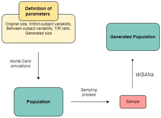 Flowchart depicting the methodology for implementing WGANs in bioequivalence studies. Initially, the entire population is created, followed by the sampling process, and ultimately applying WGANs to synthetize the generated population.