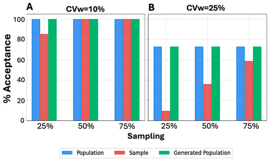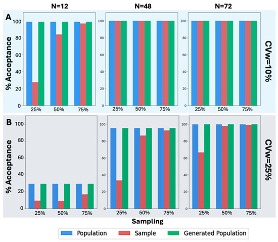 A similar analysis was also performed (Figure 5) in the case of the other original sample size values, namely, 12, 48, and 72. A visual inspection of Figure 5A reveals that the BE acceptance percentages, specifically for CVw = 10%, exhibit the same pattern as in Figure 4. The BE acceptance percentages for the generated population consistently match those of the original population. This trend continues in all scenarios where CVw = 25%, as shown in Figure 5B. Despite the increased CVw, the WGANs consistently produced identical BE acceptance percentages to those of the original population, while the sample failed in most scenarios to resemble the original. Notably, the WGANs achieved statistical resemblance even in challenging scenarios, such as 25% sampling of N = 12, which corresponds to only three patients. Remarkably, only three patients were sufficient for the WGANs’ algorithm to generate a distribution resembling the original, demonstrating the efficacy of this generative algorithm in very small sample sizes.