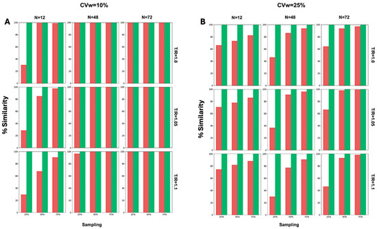 Similarity (%) between population sample (red) and between population-generated sub-jects (green) when the population consists of N = 12, 48, and 72 subjects. Two levels of residual variability (CVw) were explored: (A) CVw = 10% and (B) CVw = 25%, while the horizontal panels refer to Test/Reference (T/R) ratios of 1.0, 1.05, and 1.1.