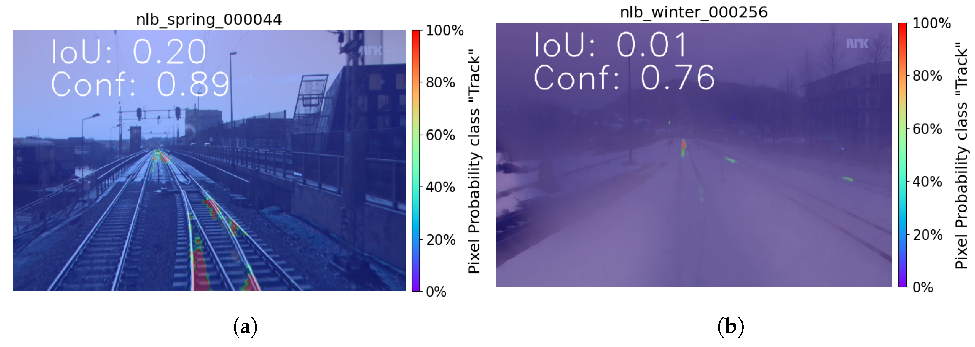 Furthermore, it can be seen that the Intersection over Union () is not sufficient as a sole evaluation metric for rail track detection. Especially in real-world applications, a more accurate evaluation of the centerline error is important. Only such metrics allow the evaluation of safety-critical failures in the predictions in contrast to only a prediction quality evaluation using the . Besides that, statistical significance testing for the IoU improvements is also important and needs to be performed in the future.