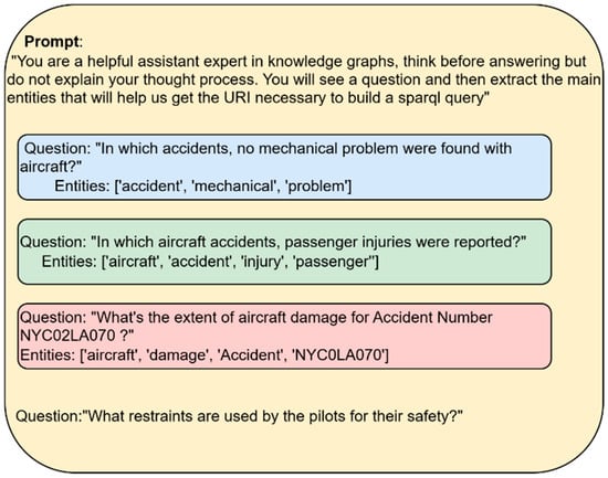 In Figure 2, an example of the prompt presented for each question is shown. First, an instruction of the task is inserted; then, three examples of the expected output are shown to the model to guide it in understanding the task; and finally, a new question is added for the model to extract the entities. Although several tools exist for performing traditional named-entity recognition, they typically focus on standard entities, such as persons, organizations, etc. However, our task required the identification of all the words or entities that could aid in finding relevant triples.