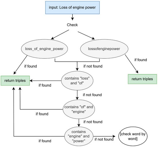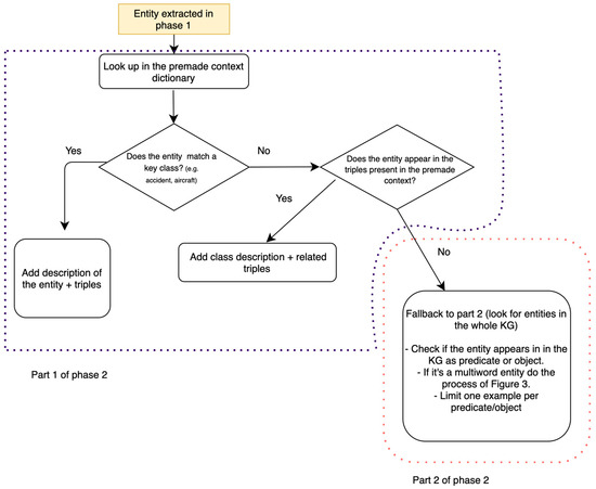 To illustrate the whole process of this phase, we provide the workflow in Figure 4. Consider the question “Which accidents caused substantial damage to aircraft?”, which would have the entities “accident,” “substantial damage,” and “aircraft.” Since “accident” is a key in the premade context dictionary, we extract the triples from there. Then, if “substantial damage” is not found in the dictionary keys, we check if it is present in any triples of the three entities that are keys in the dictionary. If this is not the case, then we proceed with the process explained in Figure 3, because it is a multiword entity. Finally, we check for the last entity (“aircraft”), which is a key in the premade queries dictionary, so we directly retrieve its associated triples.