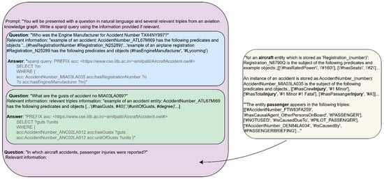 Following the presentation of three input–output examples, a new NL question is inserted. At this stage, additional contextual information, extracted during phase 2, is also provided (depicted in the box on the right in Figure 5). This supplementary information comprises relevant elements required to construct a SPARQL query capable of answering the newly introduced NL question. The effectiveness of this step is dependent on the entities identified during phase 1, as they serve as the foundation for linking the NL input to the corresponding knowledge graph triples.