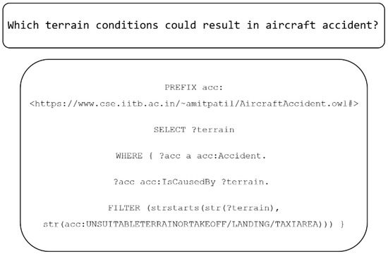 Out of the 150 natural-language questions of the test, Llama generated syntactically incorrect queries only for three of them. Two of these errors were caused by introducing special characters in the instances using a namespace prefix. In Figure 6, an example is displayed: first, the prefix “acc” was inserted to avoid repeating the full URIs in the query; then, in the “FILTER” step (at the end of the query), the entity “UNSUITABLETERRAINORTAKEOFF/LANDING/TAXIAREA” was introduced, since that was the name that was shown to the LLM in the triples examples included in the prompt and it was extracted from the KG. However, SPARQL does not accept the character “/,” which leads to a query parsing error. The other malformed query inserted spaces in the definition of the entity, which is only possible for literals; therefore, it was incorrect.