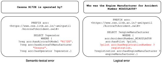 Logical errors represented approximately 12.5% of the total errors. These included the use of semantically correct predicates in contexts where they were logically inappropriate, incorrect selection of relationships to retrieve the desired information, and the use of regular expression matching without case sensitivity when it was needed. As shown in Figure 7, one such error involved using the relation “hasRegistrationNumber” to find the registration number; however, it is accidents that have a registration number and not pilots.