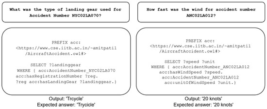 Figure 8 presents two examples of correctly generated queries. In the leftmost example, the NL question inquired about the type of landing gear involved in a specific accident. The model successfully identified the need to first retrieve the registration number associated with the accident, followed by querying the landing gear via the “hasLandingGear” relation. This reasoning process appears to be influenced by the exemplar triples provided in the prompt, which included the relation [“#Registration_N633KF,” “#hasLandingGear,” “#Tailwheel”]. In the initial phase, the phrase “landing gear” was extracted as an entity and subsequently matched to relevant triples, including the aforementioned example, thus guiding the generation of the correct query. Furthermore, the general context prompt included patterns indicating that accidents are linked to registration numbers, reinforcing the appropriate relation chain.