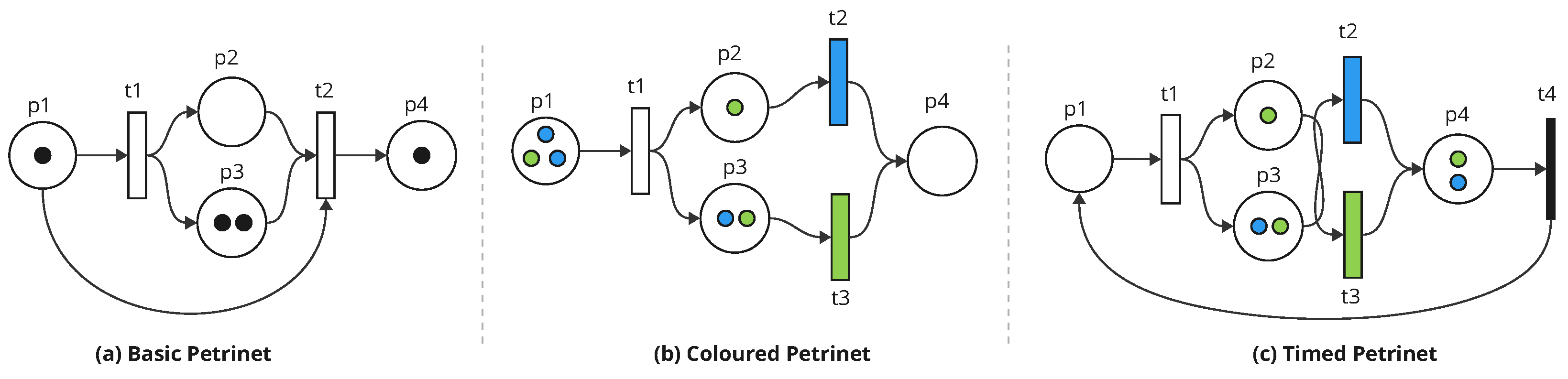 Figure 1 illustrates simple examples of different Petri net variants: (a) a basic Petri net showing places and transitions; (b) a coloured Petri net highlighting token differentiation through colours; and (c) a coloured timed Petri net that extends the model by incorporating timing to control transition firing delays.
