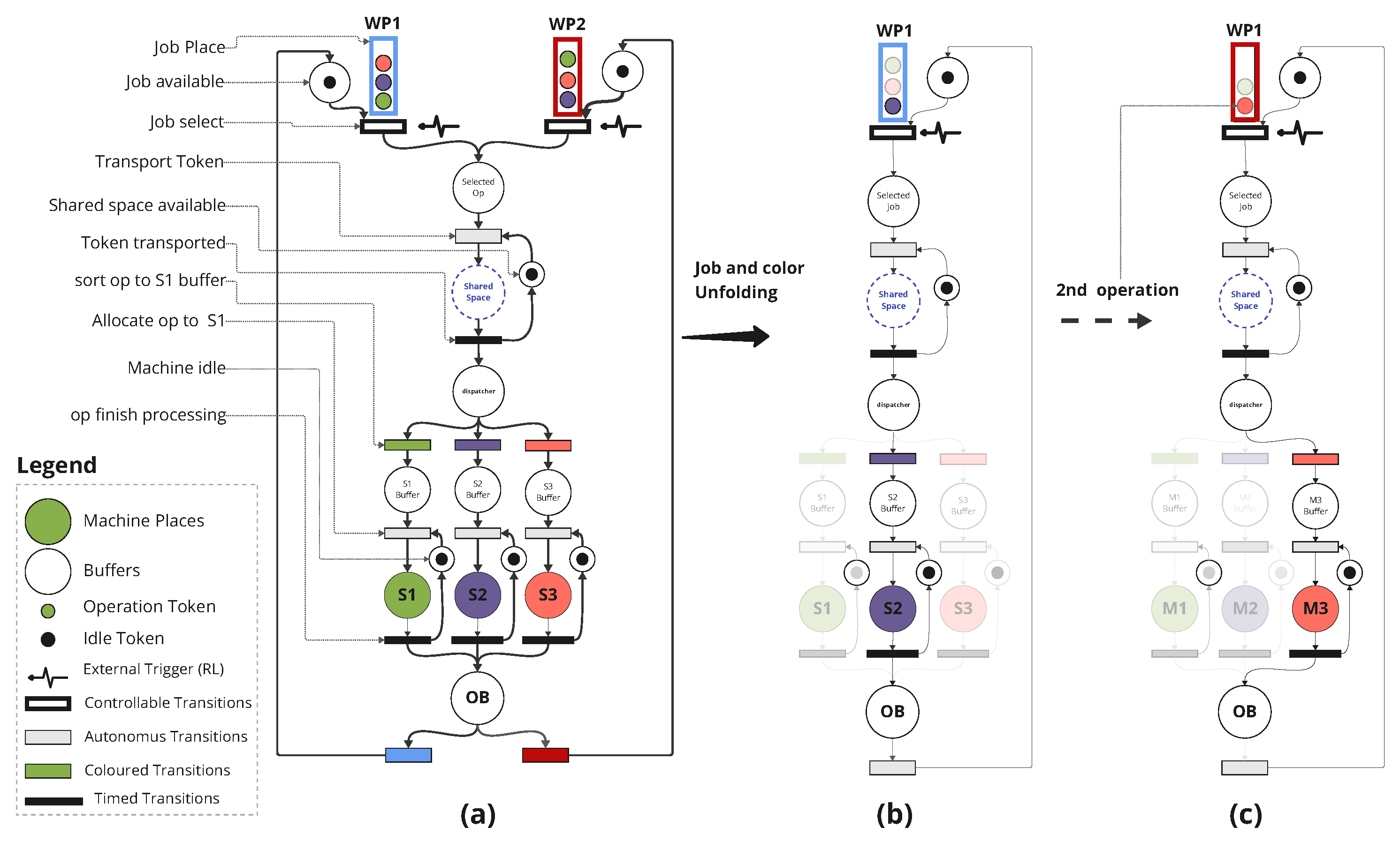 1. Lassoued, S.; Schwung, A. Introducing PetriRL: An innovative framework for JSSP resolution integrating Petri nets and event-based reinforcement learning. J. Manuf. Syst. 2024, 74, 690–702. [Google Scholar] [CrossRef]