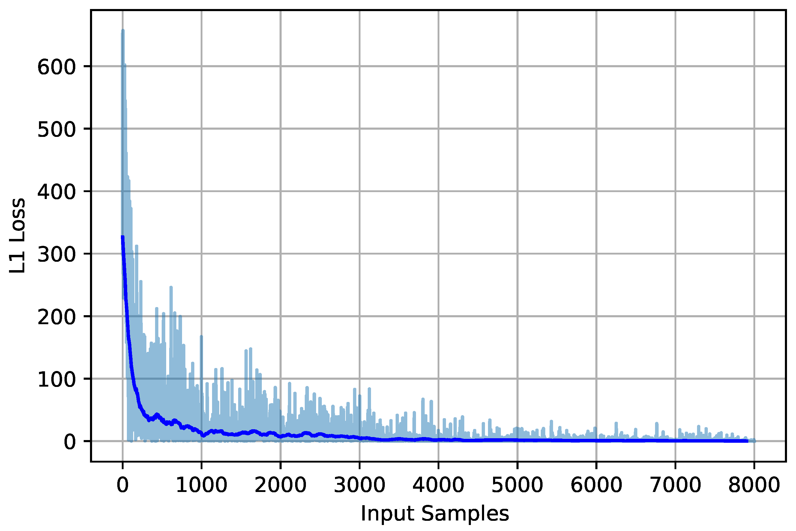 Figure 5. Element-wise L1 loss between the predicted and ground truth x ( k + 1 ) during supervised training. The light blue curve shows the actual loss, while the dark blue curve shows its moving average.