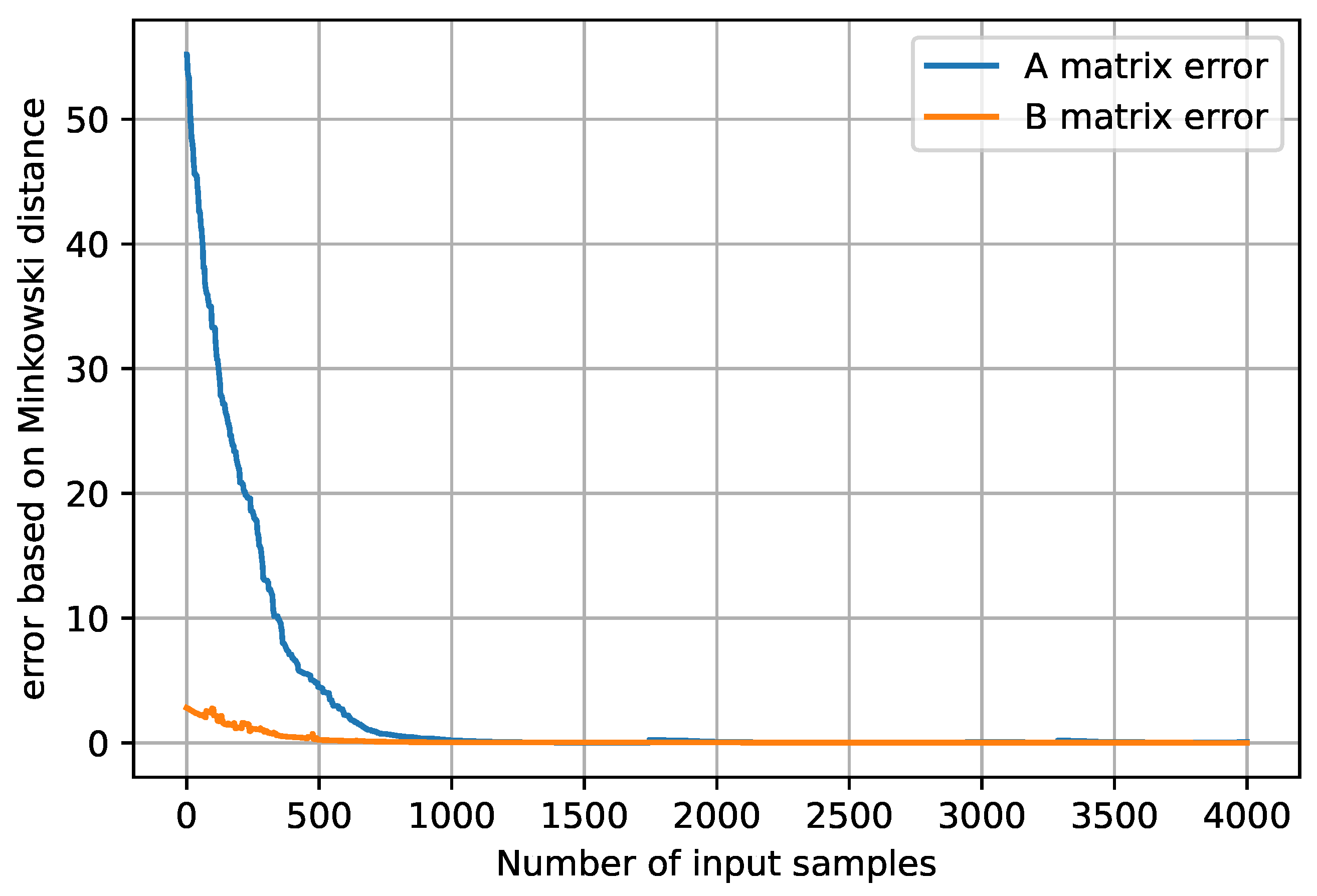 Figure 6. Training error dynamics for the learned system matrices A and B. The plot shows the decrease in the Minkowski distance between the learned matrices A ˜ , B ˜ and their reference counterparts A ref , B ref over training iterations.