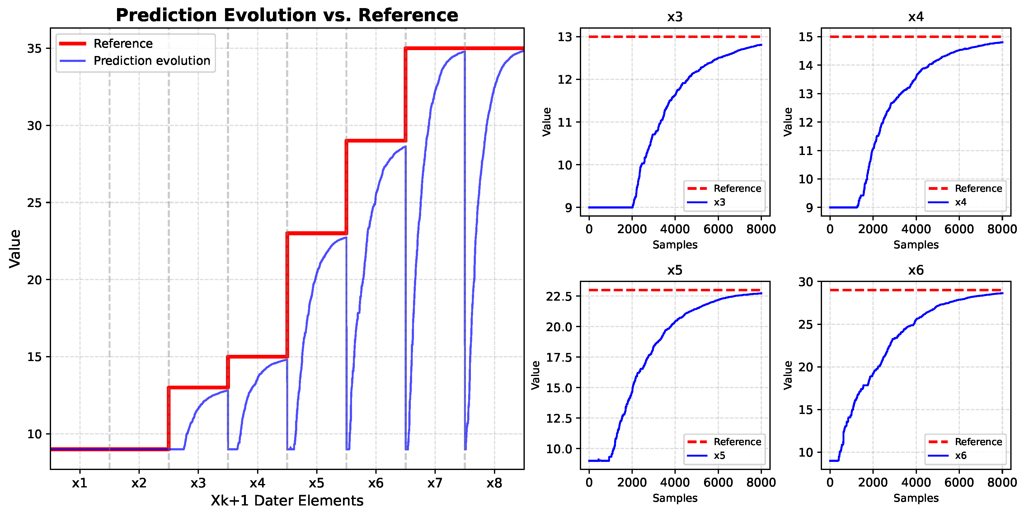 Figure 7. Comparison of prediction evolution against the reference values across all eight state segments. The top plot shows the full trajectory, while the bottom subplots detail individual predictions for states x 3 to x 6 .