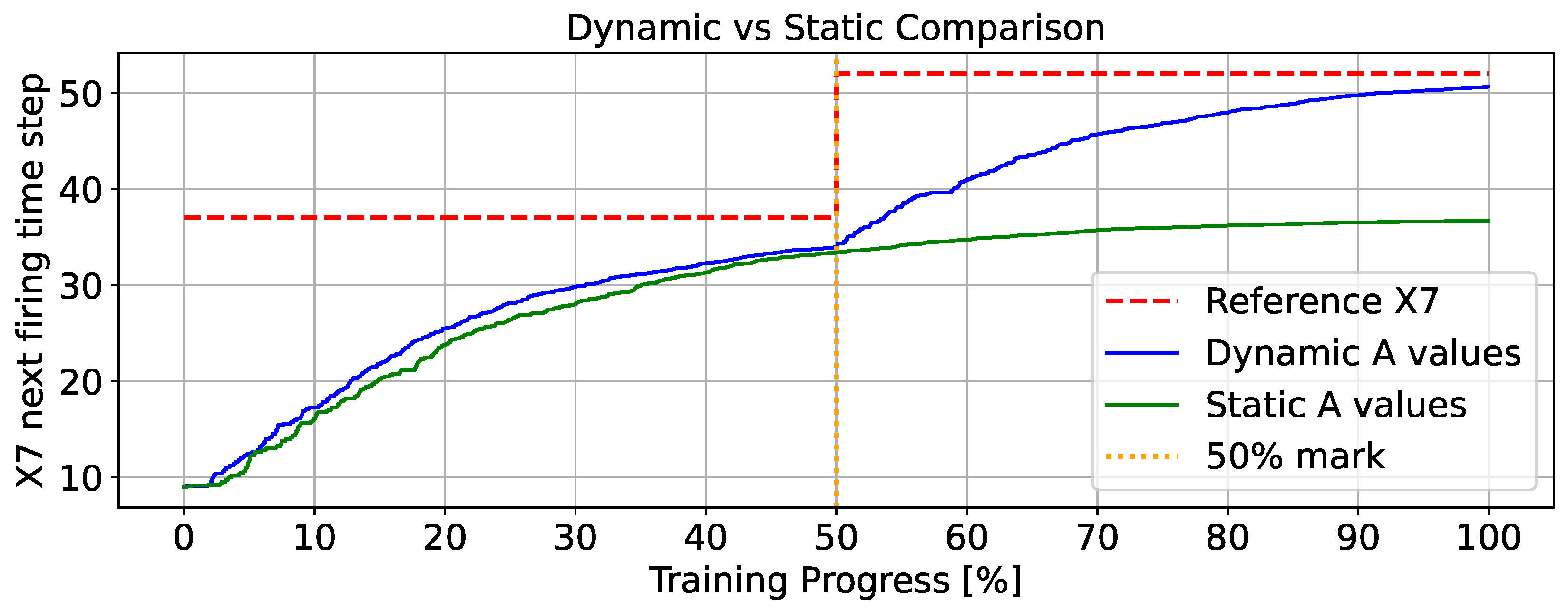 Figure 8. Transition X7 firing time evolution with matrix A changing at 50% training. The dynamic case updates the network to adapt, while the static case keeps the original matrix unchanged.