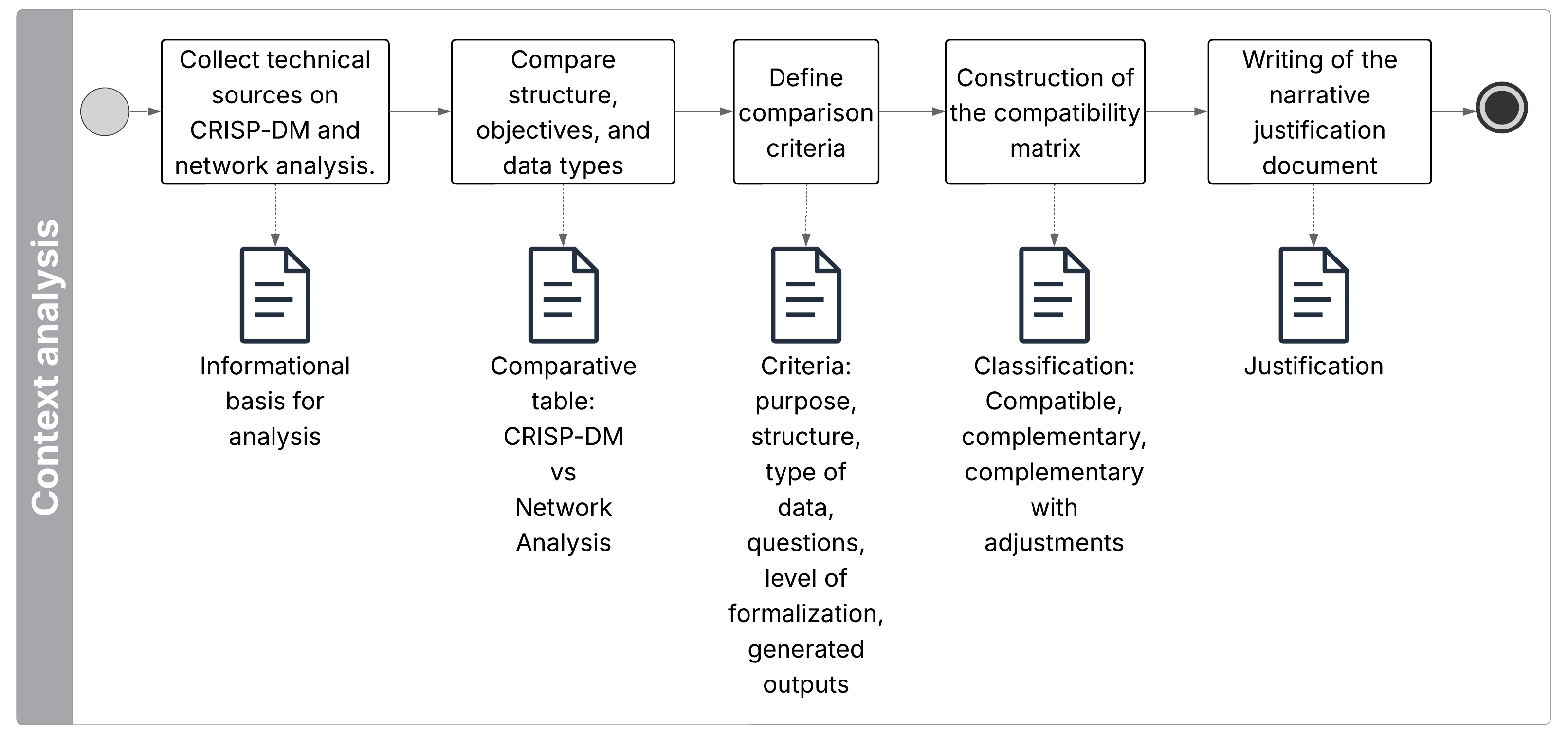 | Context Analysis | Analyze the compatibility between the CRISP-DM model and network analysis to determine their complementarity. | Context analysis and justification for the integration. | Justify the feasibility of the methodological integration. |