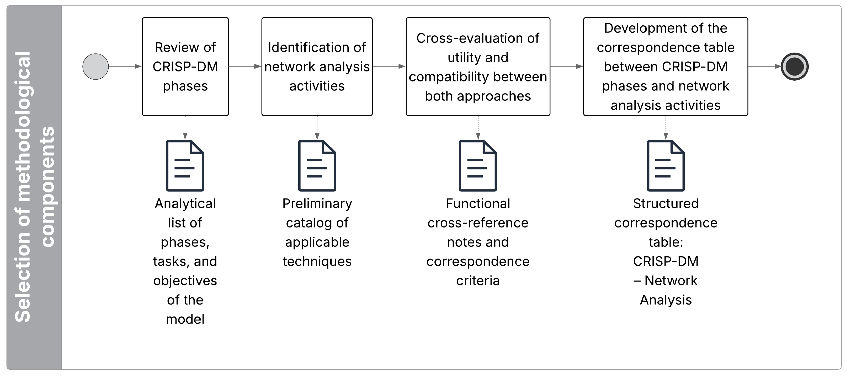 | Selection of Methodological Components | Identify key activities from network analysis (such as the construction of adjacency matrices and the use of centrality metrics) that can be incorporated into specific CRISP-DM phases, especially data preparation and modeling. | Mapping table between CRISP-DM phases and network activities. | Determine which specific components will be useful. |