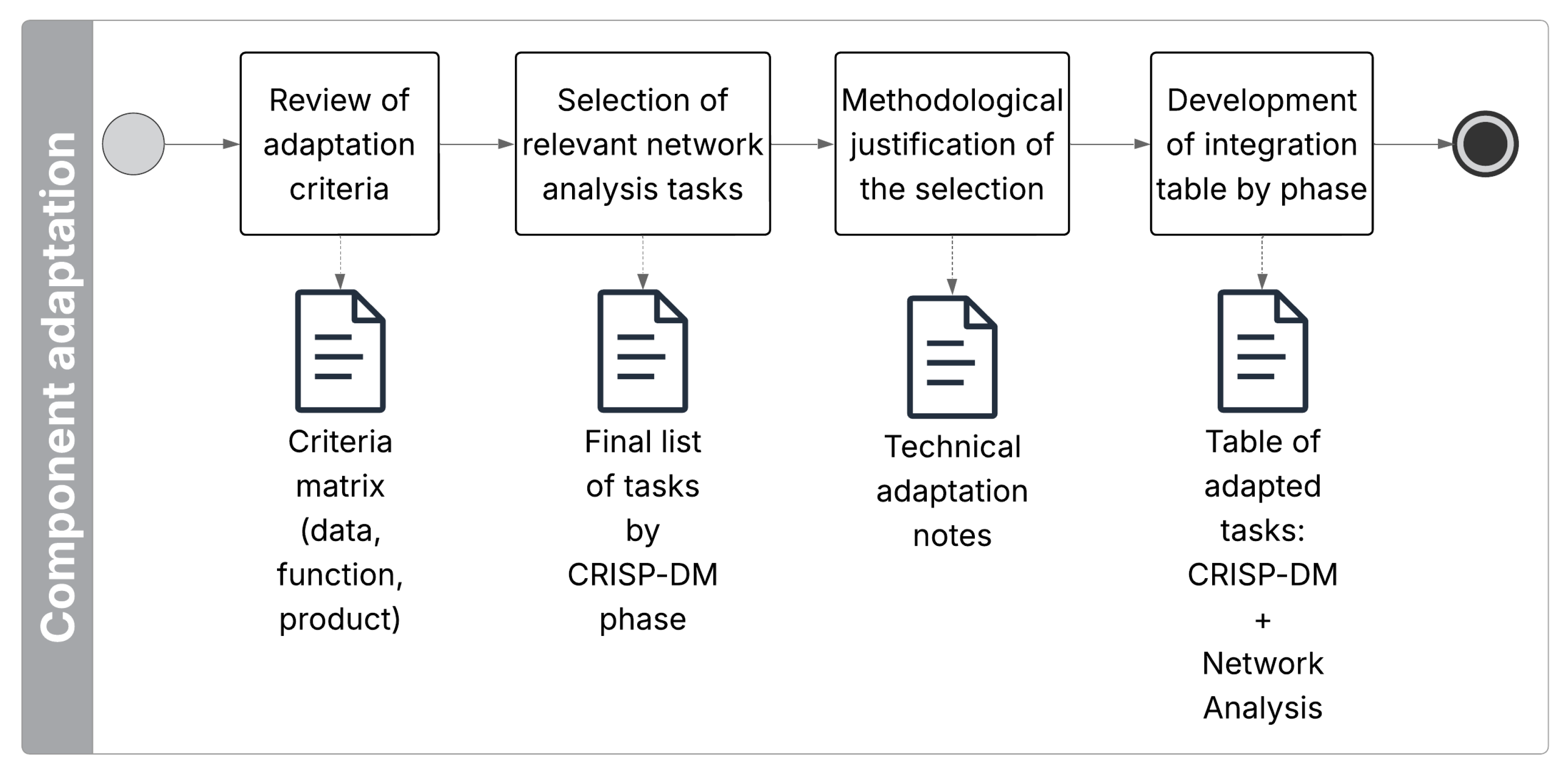 | Component Adaptation | Adjust the selected network analysis activities to the CRISP-DM workflow, defining integration criteria based on the type of data, nodes, and links involved. | Task adaptation scheme and adjustment criteria. | Ensure that network analysis tasks structurally fit. |