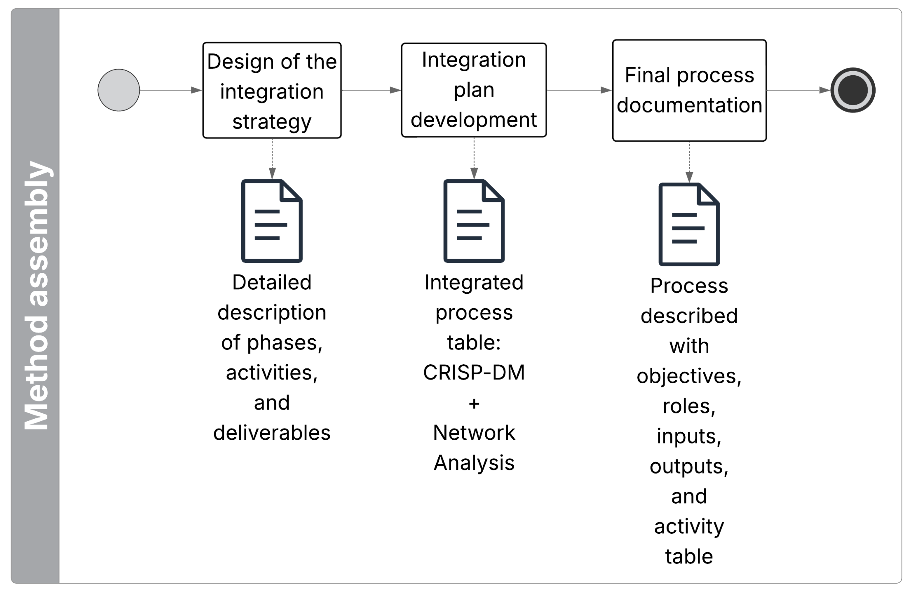 | Method Assembly | Integrate the adapted activities into the overall CRISP-DM sequence, maintaining its structural logic and ensuring a smooth transition between phases. | Methodological flow diagram and narrative synthesis of the proposal. | Consolidate a coherent and applicable sequence. |