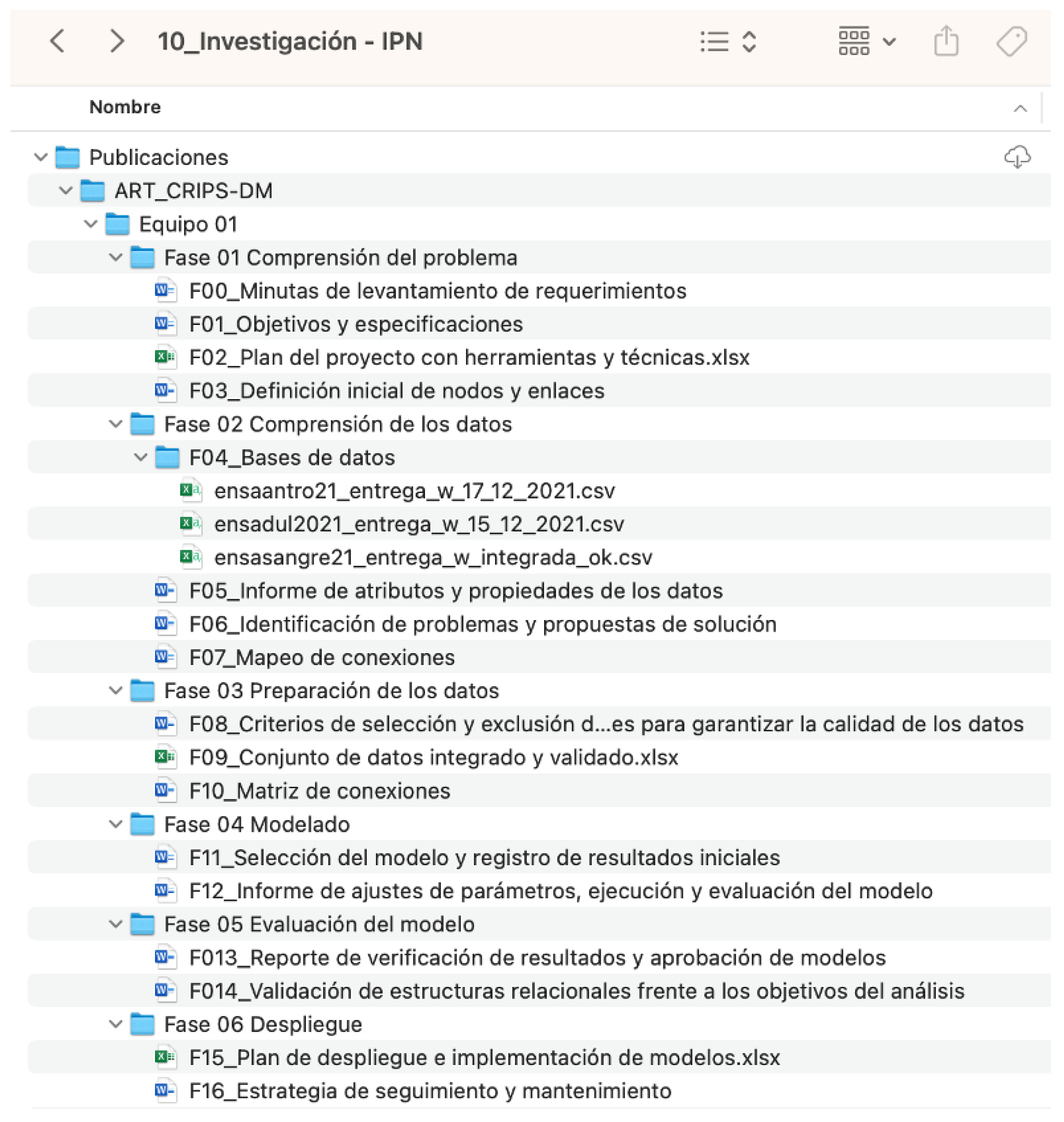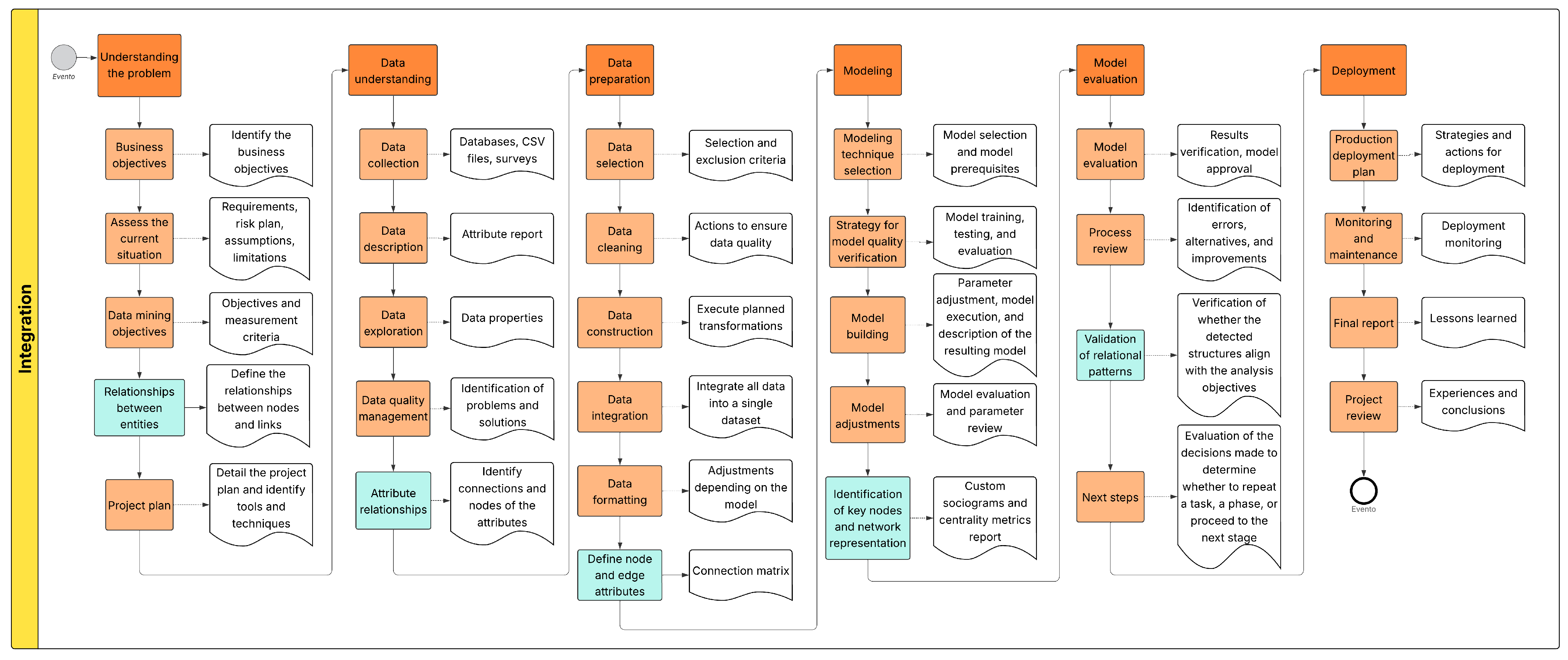 | Analytical Artifacts: | Explanatory diagrams of the sequential incorporation of activities, detailed technical notes on the definition and integration of nodes, links, attributes, and metrics in each CRISP-DM phase. |