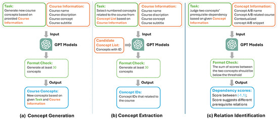 The concept generation task allows LLMs to produce outputs based on the input prompt without strict constraints or predefined response ranges. This task leverages the model’s semantic understanding and generative capabilities to generate diverse and potentially innovative responses. Previous studies on concept generation tasks have primarily focused on open-ended generation tasks [24,38]. As shown in Figure 1a, we utilize LLMs to generate relevant concepts for each course. We leverage the target course and its related information and incorporate this information to construct a prompt for LLMs. The prompt for the concept generation task consists of three components: task description, format indicator, and information injection. As illustrated in Figure 2, the task description specifies the objective, such as concept generation, and outlines the required information. The format indicator defines the desired output structure and the number of concepts to be generated. To ensure LLMs meet the specified requirements where LLMs may overlook parts of the prompt requirements, a retry mechanism is implemented to verify that the output aligns with the prompt’s criteria. Information injection provides LLMs with relevant course details, including course name, description, related concepts, video subtitles, and examples.