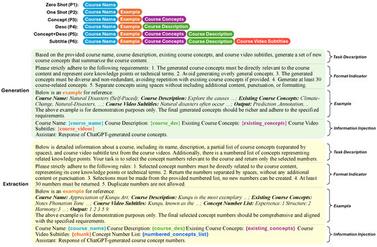In parallel with the generation task, we designed six analogous prompts for extraction, systematically varying informational granularity: Zero-Shot (P1), One-Shot (P2), Concept (P3), Desc (P4), Concept+Desc (P5), and Subtitle (P6), to provide LLMs with different levels of contextual information. Each incorporating different combinations of course information are detailed in Table 1. After designing prompts for extracting course knowledge concepts using LLMs, we successfully extracted concepts for 100 courses. These complementary concept-level tasks offer a comprehensive methodological framework to critically evaluate LLMs’ performance, particularly their generative creativity and constrained reasoning skills, in educational content scenarios.
