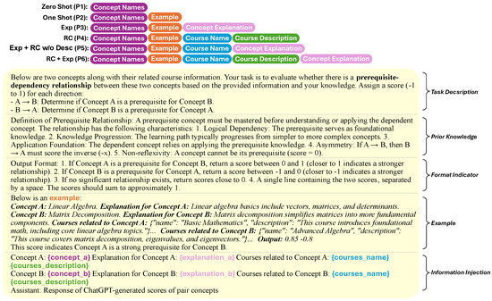 Relation identification involves identifying and extracting semantic relations between concepts from curriculum content, descriptive texts, or knowledge structures. The goal is to elucidate associations among course concepts such as prerequisite relations, similarity relations, and containment relations to facilitate the construction of knowledge graphs, improve course recommendations, and optimize student learning paths in educational contexts. Aligned with previous studies, we focus on identifying prerequisite relations [5,22]. The overall workflow, as illustrated in Figure 1c, we fed a pair of concepts (Concept A, Concept B) into LLMs with specifically designed prompts containing varying levels of information about the concepts. LLMs output a numerical score in the range of −1 to 1, representing the likelihood of a prerequisite relationship between Concept A and Concept B in the pair. We adopt the range following the design of Reference Distance (RefD) [20], which encodes prerequisite directionality on a symmetric interval. In this formulation, a positive score indicates that Concept A is likely a prerequisite of Concept B, a negative score indicates the reverse direction, and values near zero denote the absence of a prerequisite relation. Concretely, the LLM is prompted to provide two directional plausibility scores, and , each in under a mutual-exclusion constraint. We then compute a signed score , which compactly encodes both directionality and confidence. To obtain discrete labels for evaluation, we apply a thresholding step with margin : if , we assign (A is a prerequisite of B); if , we assign (B is a prerequisite of A); otherwise, we assign 0 (no relation). This threshold-based discretization ensures that uncertain cases are conservatively mapped to “no relation”. Unlike cosine similarity, which measures vector closeness, our signed scale explicitly enforces asymmetry and supports graded confidence while producing categorical judgments for downstream analysis. The prompt design is illustrated in Figure 3, which comprises four key components: task description, prior knowledge, format indicator, and information injection. The task description instructs LLMs to output likelihood scores for two scenarios: Concept A as a prerequisite for Concept B, and vice versa. We designed the prompt based on [20], which defines prerequisite relationships by stating that if Concept A is a prerequisite for Concept B, the reverse cannot be true. We incorporated this as prior knowledge, ensuring that the likelihood scores of reversed relationships ideally approach zero. To enforce this asymmetry, the format indicator includes a retry mechanism to ensure compliance and specifies that output scores range from −1 to 1, where 1 indicates Concept A is a prerequisite for Concept B, and −1 suggests the opposite. This design effectively mitigates the LLMs’ hallucination issue, ensuring more reliable outputs. The information injection component provides LLMs with relevant details about the concept pairs, including their names, contextualized concept snippets as explanations, course names, course descriptions containing the concepts, and relevant examples.