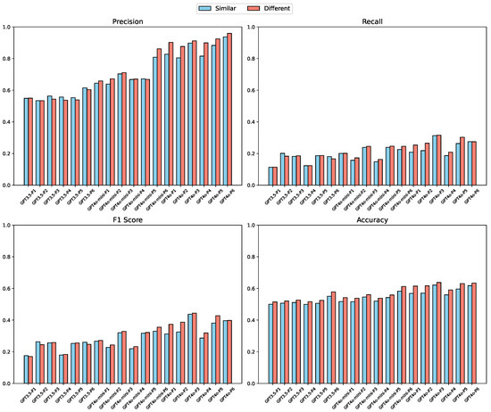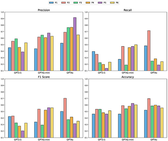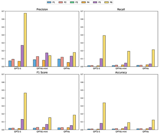 Performance comparison of different LLMs and prompt configurations on inter-conceptual relation identification task [37]. The y-axis ranges were unified across metrics to enable clearer comparison between models. The x-axis denotes different LLMs and prompt configurations (P1–P6), while the y-axis denotes the evaluation metric scores (Precision, Recall, F1 Score, and Accuracy, ranging from 0 to 1).