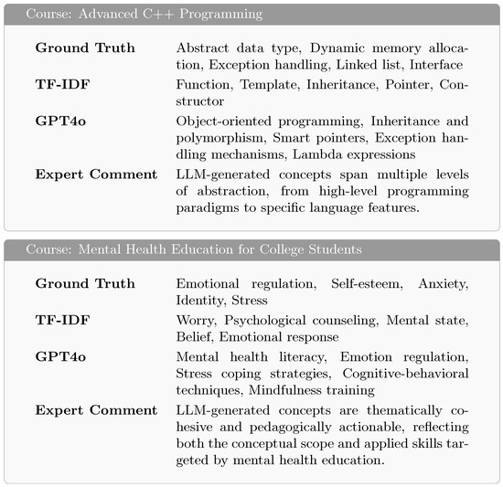 - Yang, T.; Baofeng, R.; Gu, C.; He, T.; Ma, B.; Konomi, S. Examining GPT’s Capability to Generate and Map Course Concepts and Their Relationship. arXiv 2025, arXiv:2504.08856. [Google Scholar]