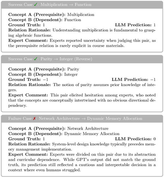 The intrinsic difficulty of the task was further confirmed through a small-scale human evaluation. Four domain experts were asked to manually annotate the same set of 100 concept pairs, and all reported that determining prerequisite relationships was nontrivial, especially for loosely defined or abstract concepts. To further contextualize model performance, Figure 9 presents three representative cases that were particularly challenging. For clarity, we interpret model predictions using discrete labels: 1 indicates Concept A is a prerequisite of Concept B, −1 indicates the reverse, and 0 denotes no identifiable prerequisite relation. In all three cases, annotators expressed uncertainty or disagreement about the directionality, yet LLMs produced predictions consistent with the ground truth. This suggests the model’s ability to capture implicit semantic dependencies that are not always made explicit in instructional materials. The first case, Multiplication → Function, involves foundational mathematical concepts. Although multiplication often underpins the understanding of algebraic functions, the dependency is rarely made explicit in curricula. Experts acknowledged this, and LLMs correctly identified the latent prerequisite relationship. The second case, Parity → Integer (Reverse), is particularly subtle. While parity depends on the concept of integers, the two are closely linked, and several annotators were unsure about whether a directional prerequisite could be definitively assigned. LLMs’ reverse-direction prediction matched the ground truth and reflected a reasonable conceptual interpretation. The third case, Network Architecture → Dynamic Memory Allocation, exemplifies a failure instance. Though the ground truth labels architecture as a prerequisite, the relationship depends heavily on curricular framing. Experts were divided in their annotations, and LLMs defaulted to predicting no dependency. While incorrect, the output reflects the model’s cautious behavior under semantic uncertainty. These examples illustrate both the reasoning potential of large language models and the inherent ambiguity of prerequisite relation identification. They further support the view that LLMs’ performance in this task, while imperfect, represents meaningful progress toward modeling instructional structures.