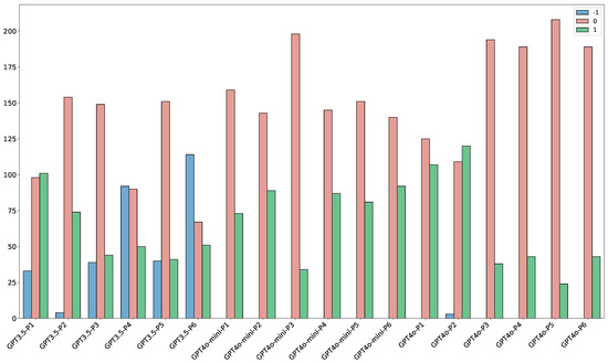 Distribution of LLMs’ discretized outputs (, 0, ) across all prompt–model combinations. The x-axis denotes different LLMs and prompt configurations (P1–P6), while the y-axis indicates the number of predictions assigned to each discrete label (, 0, ).