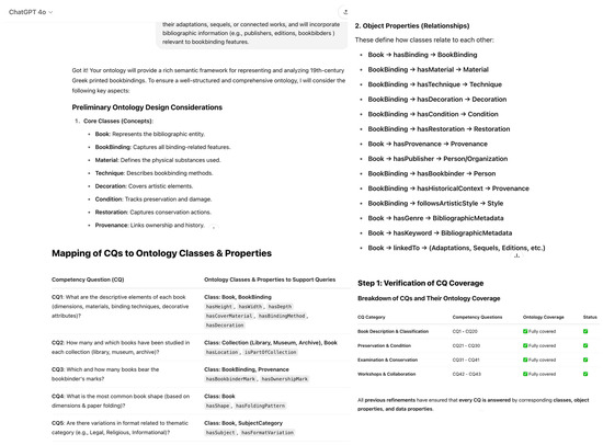 The integration of Large Language Models (LLMs) to knowledge graph (KG) engineering introduces new possibilities for automating and enhancing the documentation of cultural heritage. LLMs have demonstrated remarkable capabilities in natural language processing, enabling the extraction, structuring, and reasoning over domain-specific knowledge at an unprecedented scale. In the context of ontology development, LLMs can assist in generating taxonomies, identifying relationships between concepts, and formulating complex queries for knowledge retrieval [12,13]. For cultural heritage applications, this means that vast amounts of textual data—ranging from historical records to conservation reports—can be systematically processed and incorporated into structured knowledge systems. By leveraging LLMs in the construction of bookbinding ontologies and knowledge graphs, it becomes possible to automate parts of the ontology engineering process, enhance semantic reasoning, and provide users with intelligent querying capabilities that facilitate research and conservation efforts [13,14]. This approach moves beyond static metadata structures, offering a dynamic, machine-readable representation of bookbinding knowledge that can evolve over time with new data inputs. This case study addresses that specific gap by demonstrating how a structured, semantically rich knowledge graph can encode these overlooked physical and conservation-related attributes using LLM-assisted modeling.