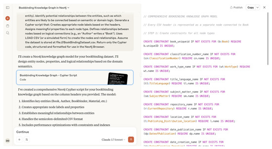 The implementation of the BookBindKG framework relied on a carefully selected suite of tools and technologies that support semantic modeling, scalable graph construction, and accurate data representation. At the core of the process was the use of a state-of-the-art large language model—ChatGPT-4o—which was employed during two key stages: ontology engineering and Cypher script generation for graph instantiation. ChatGPT-4o was chosen for its advanced contextual reasoning capabilities and its ability to generate structurally coherent, domain-informed outputs from prompt-driven interactions.