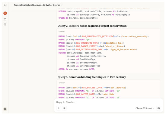 The intention behind these queries was to replicate realistic questions that would typically arise in the bookbinding domain, with a focus on saving time, reducing manual search effort, and enabling stakeholders to retrieve valuable knowledge efficiently from a complex and interconnected dataset. These queries were compiled with the assistance of domain experts (researchers on book binding and conservation) and were designed to bridge different types of knowledge and entities across the graph, a task traditionally challenging without such automated support: