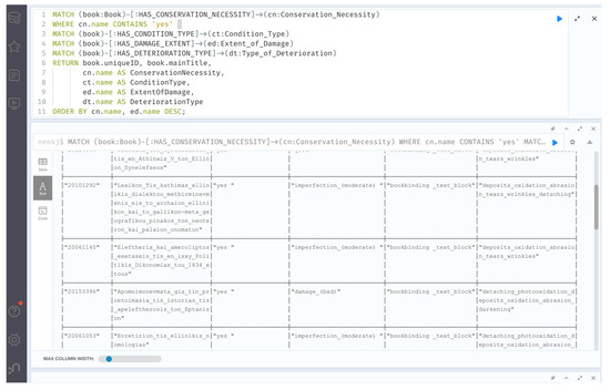 All constructed queries were found to be functional, and the result validation phase demonstrated that they returned accurate and complete results. Furthermore, the retrieval time through the knowledge graph interface was at least 20 times faster compared to manual checking methods. The manual checking involved inspecting the CSV file directly (converted into an Excel document and utilizing the functionality provided by Excel, such as sorting, filtering, and searching), which proved significantly slower and prone to oversight.
