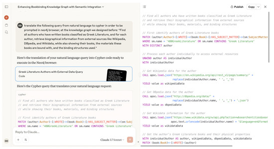 Translation of a complex query into Cypher using Claude 3.7 Sonnet, integrating external semantic data sources (Wikipedia, DBpedia, and Wikidata) into the bookbinding knowledge graph.