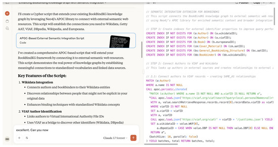 Building upon our established framework, we propose an APOC-based extension that transforms BookBindKG from a self-contained knowledge repository into a dynamic, interconnected semantic hub. This extension leverages Neo4j’s APOC library (https://neo4j.com/labs/apoc/ as accessed on 24 April 2025) (Awesome Procedures On Cypher) to establish direct API connections with key semantic web resources, including Wikidata for entity lookup and enrichment, DBpedia for contextual enrichment, and Wikipedia for descriptive content. By implementing these connections, we aim to demonstrate how our domain-specific bookbinding knowledge can be seamlessly integrated into the broader fabric of linked cultural heritage data, enabling more sophisticated queries and insights than would be possible with isolated data alone.