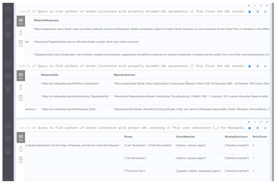 Third, the experiment involving the addition of internationally recognized authors (Kazantzakis, Papadiamantis, and Elytis) showcased how the integration of external linked data sources (Wikidata, DBpedia, and Wikipedia) through Neo4j APOC procedures can significantly enrich domain-specific datasets. Through this method, we not only expanded the biographical and contextual metadata available for querying but also validated the extensibility of the BookBindKG framework to cross-domain and cross-institutional knowledge ecosystems.