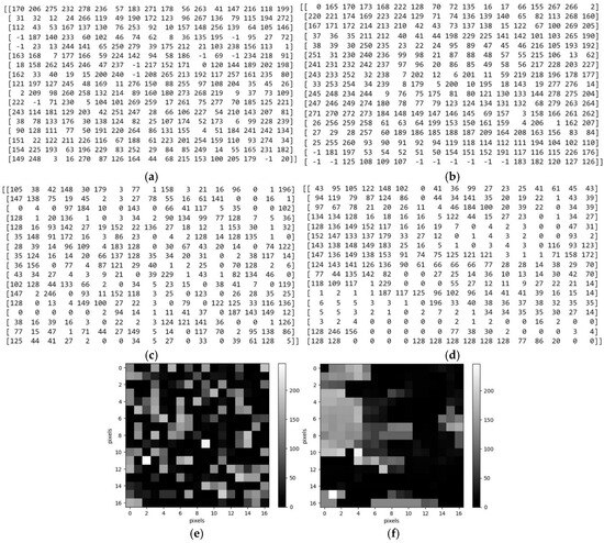 Example of correspondence between the value within the dataset and the pixel. (a) Grid random arrangement; (b) grid arranged; (c) pixels random arrangement; (d) pixels arranged; (e) representation of the matrix of (c) visually depicted as an image; (f) representation of the matrix of (d) visually depicted as an image.