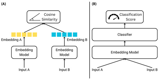 (A) shows the independent encoding of the bi-encoder, and (B) demonstrates the joint processing of the cross-encoder.