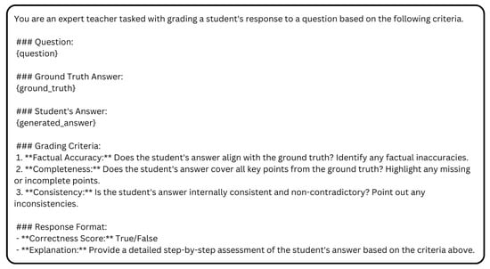 The correctness metric evaluates the accuracy, completeness, and consistency of a generated response against a ground truth answer, ensuring that the output is both factually sound and comprehensive. This is especially critical in healthcare, where precision and trustworthiness are essential [40]. By leveraging GPT-4o [41], the metric checks whether the generated answer aligns with the ground truth, detects factual inaccuracies, and determines whether all key aspects are addressed. It also verifies internal consistency, ensuring the response is free from contradictions. The evaluation yields a binary correctness score (True/False) along with a detailed explanation, offering a transparent assessment of the model’s performance. The prompt used for this evaluation is shown in Figure 4.