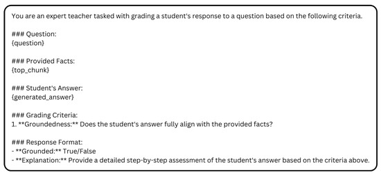 The groundedness metric assesses how closely a generated response adheres to the provided factual information, ensuring that the answer is accurate and well-supported. This is particularly crucial in fields such as healthcare, where maintaining trust and data fidelity requires responses to be anchored in verified evidence. The metric determines whether the content of the response faithfully reflects the given facts, assigning a groundedness score (True/False) along with a detailed explanation of the evaluation. The prompt used for this assessment is shown in Figure 6.