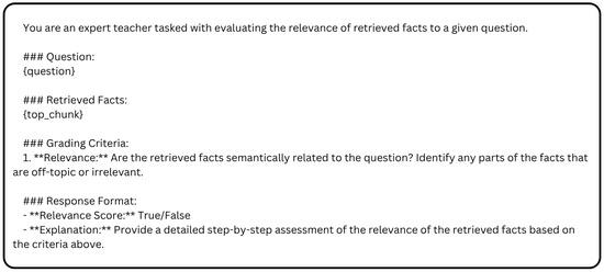 The retrieval-relevance metric evaluates the semantic alignment between the retrieved facts and the input question, ensuring that the information presented is directly applicable and meaningful. Using an LLM-based assessment, the metric determines whether the retrieved content is contextually related to the query, flagging any irrelevant or off-topic material. The evaluation produces a binary relevance score (True/False) along with a detailed explanation, offering transparency into the rationale behind the judgment. The prompt used for this evaluation is shown in Figure 7.