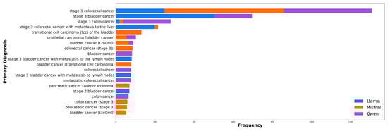 Distribution of the Top 20 primary diagnoses across Llama, Mistral, and Qwen Datasets.