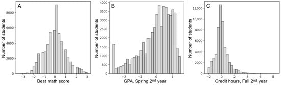Example histograms after Z-score standardization. (A) the highest math score on either the ACT or the SAT, (B) the GPA calculated based on courses taken during the Spring semester of the second year, and (C) cumulative number of credit hours earned as of the Fall semester of the second year. The Z-score of 0 corresponds to the mean value of the original score, and the units on the x-axis represent standard deviations from the mean.